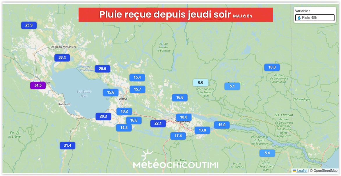 | Chicoutimi | 8.4 °C | 6 kmh WSW | 17.2 mm | 24.4 mm | 988.8 hPa | 93 % | 11:10 | 8.4 °C à 11:07 | 6.8 °C à 00:00 | 33.8 km/h à 03:22 | 57.6 mm |