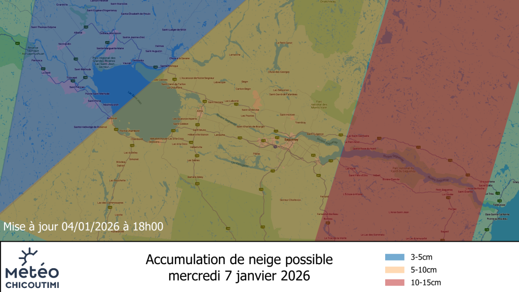 Ce sera notre première bordée de 2026 avec le passage d’un système dépressionnaire qui devrait laisser entre 5 et 10cm de neige. Neige qui devrait débuter au courant de la nuit de mardi à mercredi et se poursuivre toute la journée de mercredi pour cesser mercredi soir. Ce sera sous forme de neige tombant de façon continue qui par moment pourrait tomber de façon plus soutenue mercredi matin. Le vent devrait être calme avec un maximum autour de -3°C! Ça risque d’être utile afin de déglacer de nombreuses routes qui sont plus que glacées.