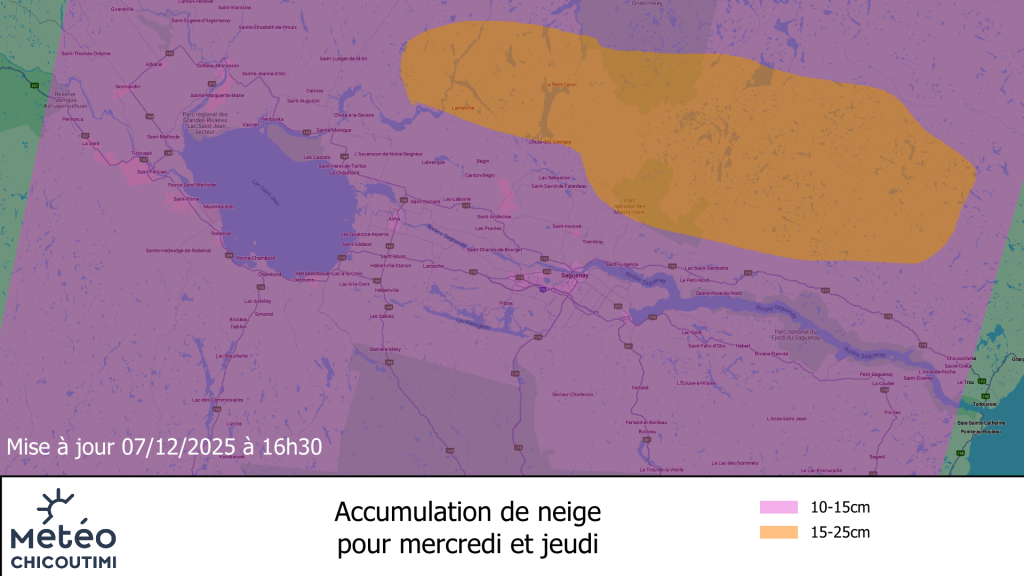 Le système à surveille cette semaine va débuter mercredi matin avec le passage d’un système dépressionnaire qui devrait laisser entre 10 et 20cm de neige sur l’ensemble de la région entre mercredis matin et jeudi soir. Donc ce n’est rien de majeur en termes d’accumulation, au niveau du vent, mercredi on parle de pointes de 30 à 40 km/h alors que ce sera un peu plus compliqué jeudi avec le retrait du système qui va favoriser des pointes oscillant entre 40 et 60 km/h du nord-ouest.