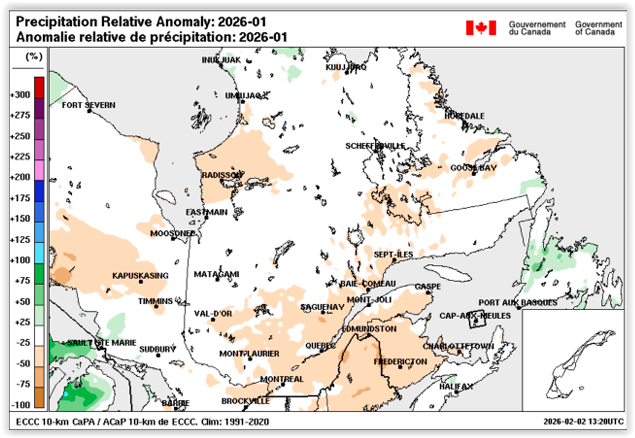 Au total, plusieurs régions ont affiché un léger déficit de précipitations, notamment le long du fleuve, certains secteurs du centre/ouest et des zones près de la Baie James / Baie d’Hudson.