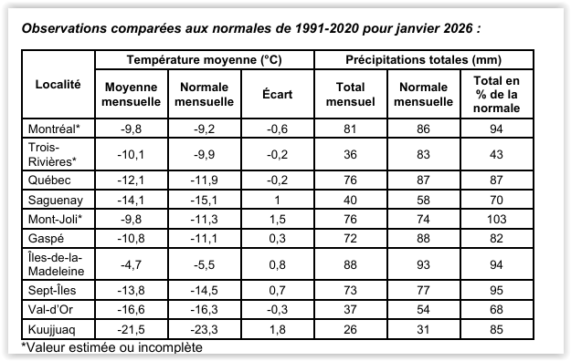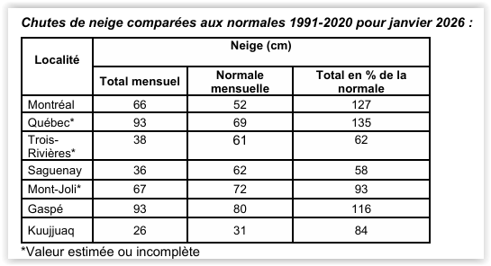 • Neige : souvent près des normales, mais avec de gros contrastes régionaux (ex : Saguenay sous la normale).