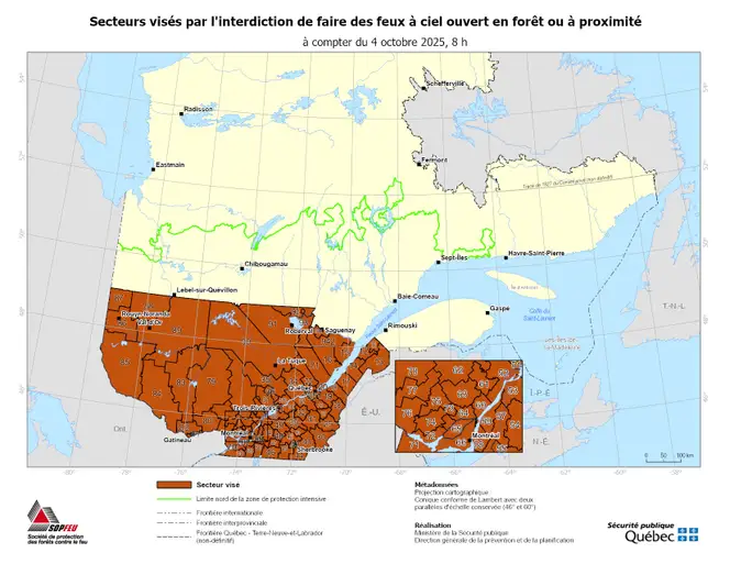 Québec, le 3 octobre 2025 — Le ministère de la Sécurité publique, en collaboration avec la SOPFEU, a annoncé qu’à compter du 4 octobre à 8 h, une interdiction de faire des feux à ciel ouvert en forêt ou à proximité entrera en vigueur dans de nombreux secteurs du Québec, incluant certaines parties du Saguenay–Lac-Saint-Jean.