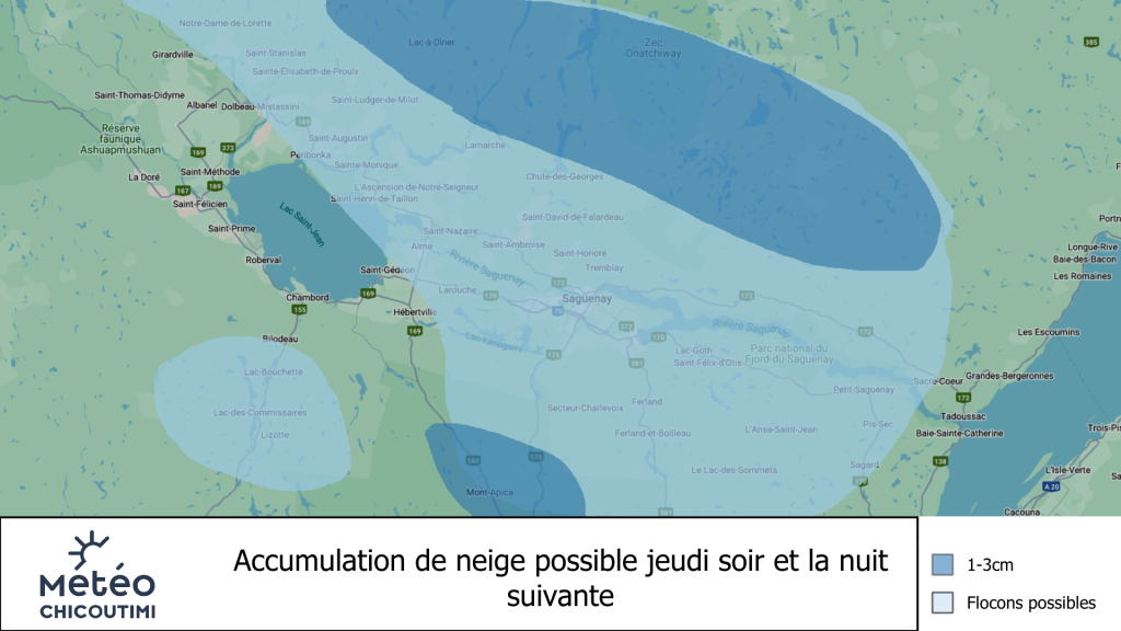 Tout ceci pour dire que la pluie devrait se changer en neige en terrain montagneux à compter de jeudi soir, on parle ici des monts Valin ainsi que du parc des Laurentides. Cette neige devrait se poursuivre jeudi soir, la nuit suivante ainsi que vendredi matin. Bien malin celui qui pourrait prédire le nombre de centimètres possible, mais je ne sais pas surpris de voir quelques centimètres de neige dans les hauteurs des monts Valin vendredi matin. Au niveau du parc des Laurentides, on ne parle pas d’accumulation pour le moment, ce sera à suivre.