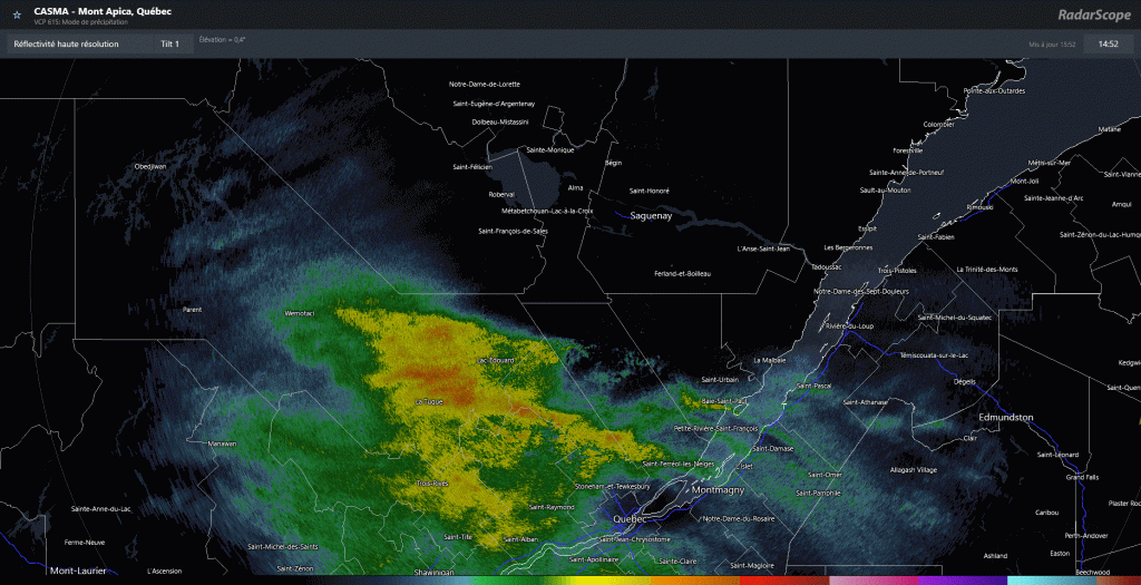 On ne parle pas de précipitations en continu, mais bien d’averses donc par moment le ciel sera tout simplement nuageux et les averses vont reprendre plus tard. Il pourrait tomber jusqu’à 2mm sur le Saguenay et Bas-Saguenay, alors que dans le parc des Laurentides on parle de plus de 10mm d’accumulation. Nos amis du Lac-Saint-Jean pourraient possiblement s’en sauver, à suivre.