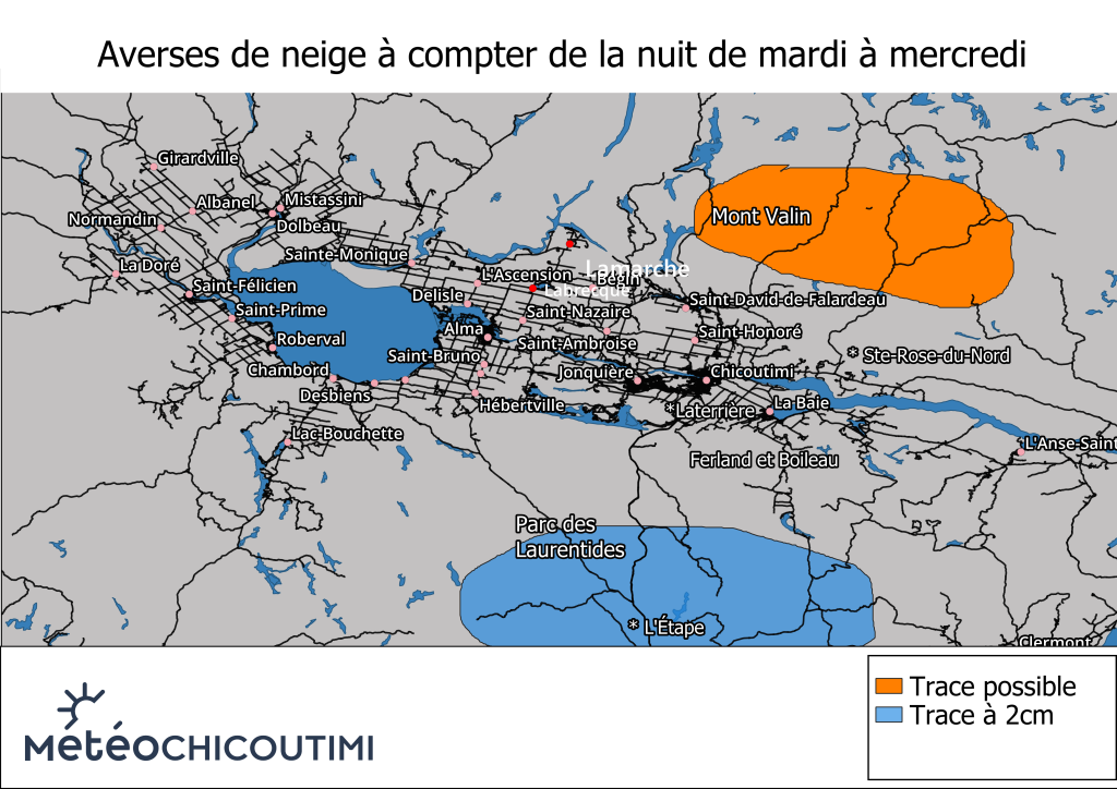 Les averses de pluie vont se changer en averses de neige sur le parc des Laurentides, il serait possible d’accumuler 1-2cm sur les plus hauts sommets, pas nécessairement sur la chaussée, mais en bordure de celle-ci. Des flocons seront aussi visibles sur les monts Valin, mais ce sera sans accumulation.