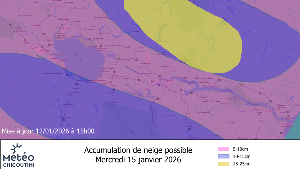 L’action, sous forme de neige devrait s’installer à compter de mardi soir, quelque part autour de 20/21h. Neige qui pourrait tomber à un bon rythme au courant de la nuit de mardi à mercredi. La neige va se poursuivre tout la journée de mercredi, mais sous forme d’averses, donc par moment le ciel sera tout simplement nuageux et la neige va reprendre un peu plus tard. Ce sera le scénario pour la journée de mercredi ainsi que mercredi soir ainsi que la nuit suivante. Tout porte à croire qu’il risque de se produire un assèchement de la masse d’air pendant l’évènement puisque le vent risque d’être bien présent dans le fjord, en pointes oscillant entre 40 et 60 km/h de l’est. Le mercure devrait atteindre un maximum de +3°C puis ce sera suivi d’une importante chute du mercure qui va s’amorcer à compter de jeudi matin pour nous apporter à -22°C jeudi après-midi et autour de -33°C vendredi matin!