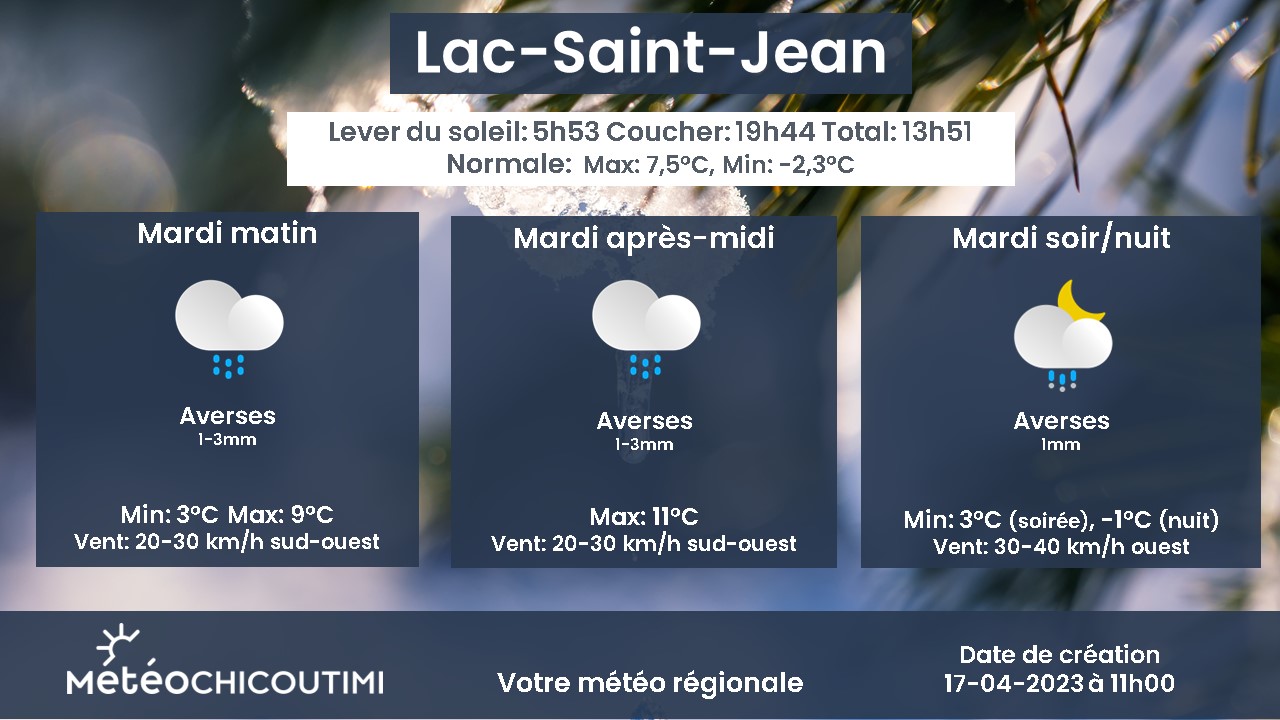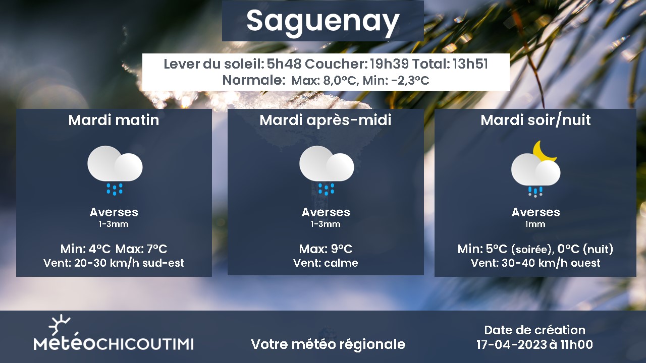 Pour ce qui est du vent, le Saguenay et Bas-Saguenay, on parle de pointes qui pourraient atteindre jusqu’à 70 km/h jusqu’à environ minuit. Pour nos amis du Lac-Saint-Jean, les pointes vont osciller entre 40 et 60 km/h jusqu’à minuit. Après minuit, le vent va diminuer pour atteindre des pointes de 30 à 40 km/h au Lac-Saint-Jean. Saguenay et Bas-Saguenay, le vent va atteindre des pointes à 50 km/h.