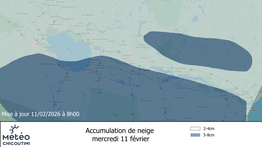 La neige va se poursuivre toute la journée, que ce soit au Saguenay, Bas-Saguenay ainsi qu’au Lac-Saint-Jean. Toujours sous forme de faible neige qui devrait se poursuivre mercredi soir ainsi que la nuit suivante pour cesser jeudi matin. Le mercure sera confortable avec un maximum autour de -4°C !! Le vent sera de l’est en pointe de 30 à 40 km/h en matinée pour diminuer à des pointes de 20 à 30 km/h en après-midi.