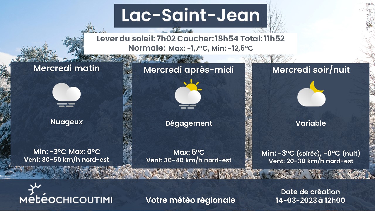 Ce sont les nuages qui seront très présents, et ce partout dans la région. Des averses de neige (sans accumulation) vont affecter le Bas-Saguenay. Du côté du Saguenay, il y aura quelques flocons par moment. Pour le Lac-Saint-Jean le ciel ne sera pas couvert à 100% ce soir et vous pourriez recevoir quelques flocons cette nuit. Les minimums mardi soir vont varier entre 0 et 3°C selon le secteur de la région et les minimums la nuit prochaine vont varier entre -8 et -2°C. Le vent sera plutôt calme, sinon ce sera 20 km/h du nord-est ou nord-ouest selon où vous demeurez.