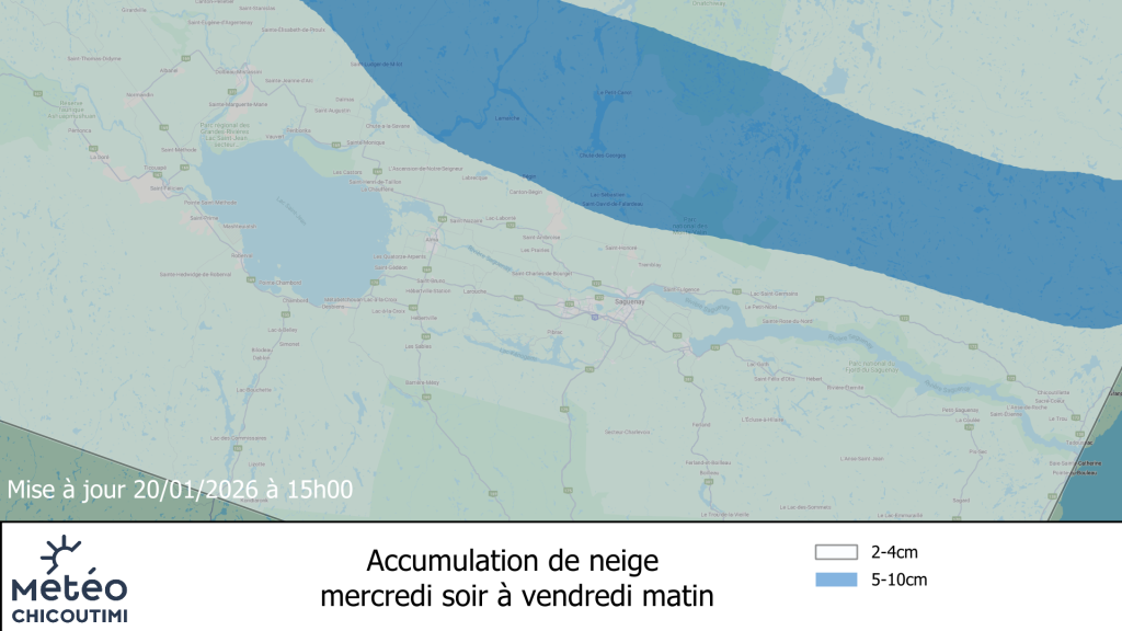 C’est un système dépressionnaire qui va s’installer à compter de mercredi soir, ce sera sous forme d’averses de neige. Donc par moment le ciel sera tout simplement nuageux et à d’autres moments c’est la neige qui sera présente. Ces averses vont se poursuivre tout au long de la journée de jeudi pour cesser vendredi matin. La carte des accumulations est disponible un peu plus bas.