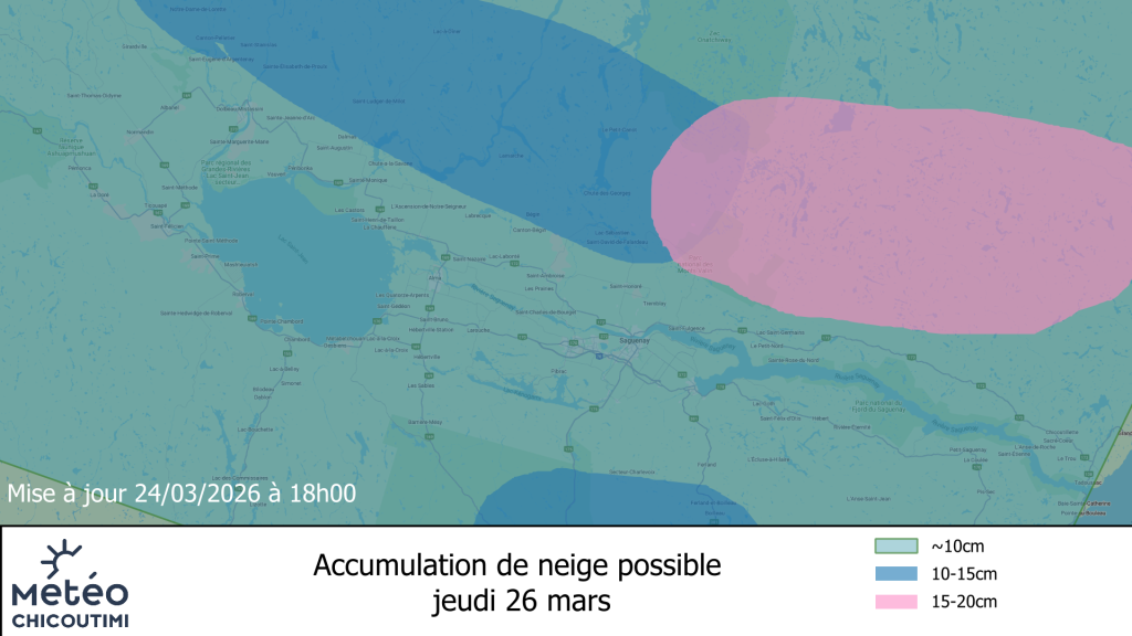 Ce sont des averses de neige qui vont s’installer d’ici 21h sur l’ensemble de la région. On parle de faibles averses sans trop de conséquences, mais un front froid va balayer la région vers minuit ce soir. Ce qui pourrait occasionner de fortes averses de neige/bourrasque de neige lors du passage de ce front. En cas de bourrasque, la visibilité sera réduite temporairement. Au niveau des accumulations, on parle d’un gros 2 centimètres, peu importe le secteur de la région.