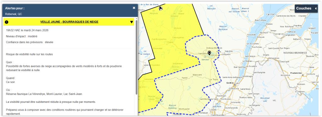 Le vent va aussi se mettre de la partie (si ce n’est pas déjà fait) pour passer au nord-ouest en pointes oscillant entre 40 et 60 km/h. Le mercure sera à la baisse ce soir pour atteindre entre -2 et -5°C, suite au passage du front froid, il va rapidement chuter pour atteindre entre -22 et -18°C mercredi matin! oh lala!