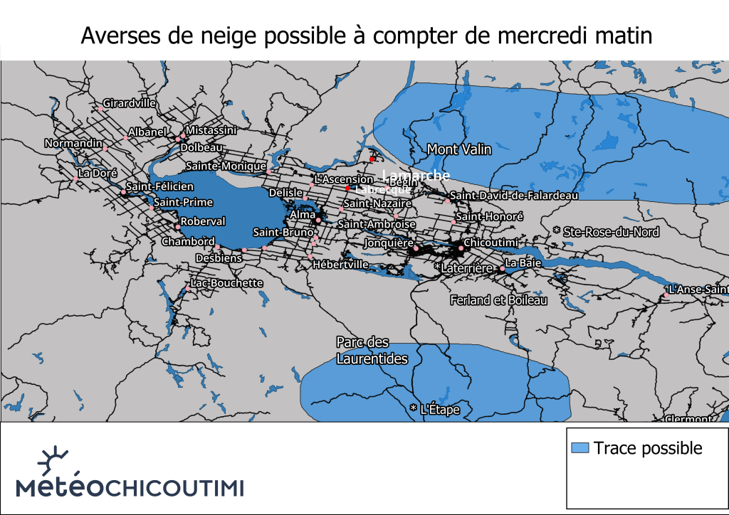 Ce sera une journée sous le signe de l’instabilité, débutons avec le parc des Laurentides ainsi que les monts Valin qui auront la chance d’observer des flocons dès le lever du jour et ce jusqu’en fin de journée. On ne parle pas de véritable accumulation, peut-être une trace par endroit. Outre les montagnes, « en ville » ce sera une journée sous un ciel qui sera variable avec des averses (de pluie) qui pourraient se produire à tout moment, en cas d’averses ce serait de courte durée et de faible intensité. Le mercure devrait atteindre un énorme 10°C (c’est loin des 30°C de dimanche et lundi) et le vent sera du nord-ouest en pointes de 30 à 50 km/h. Prévoyez une petite laine, elle sera nécessaire!