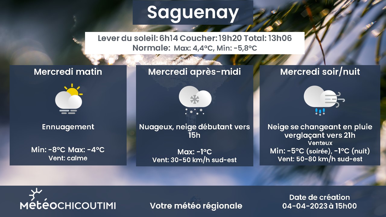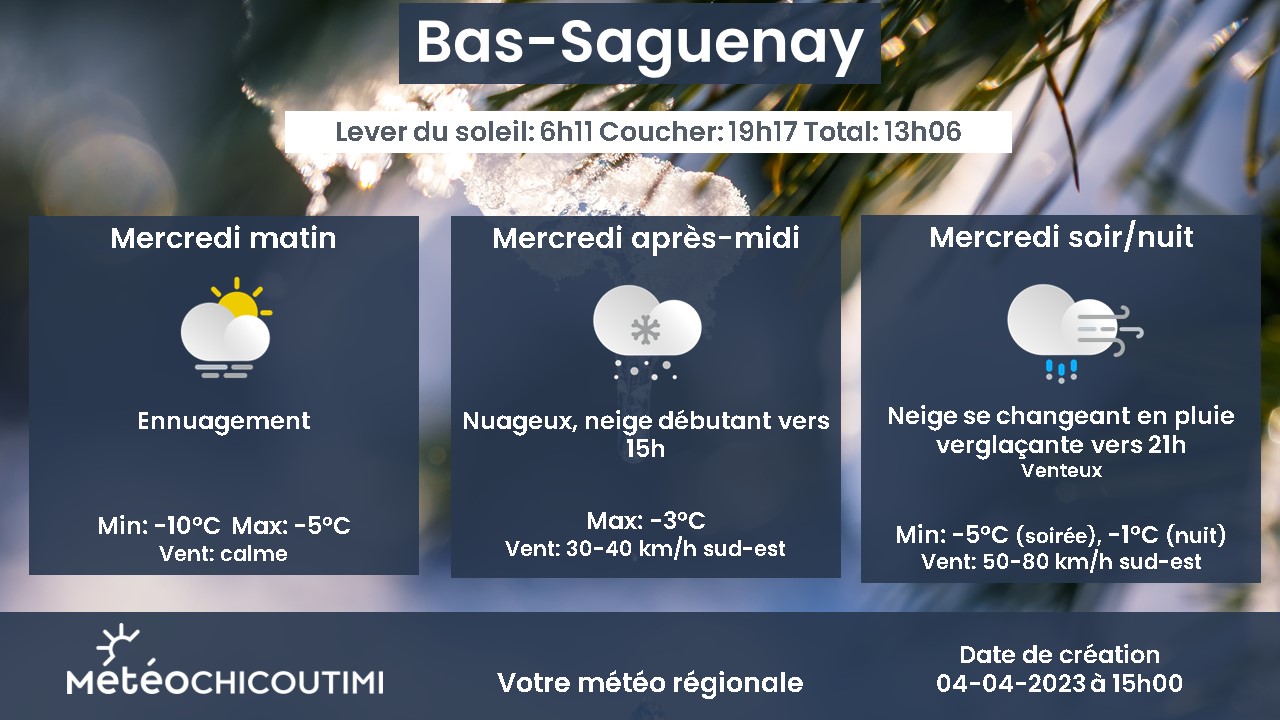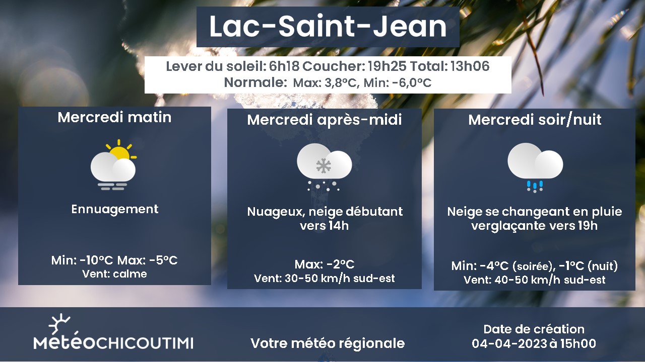 Les premiers flocons devraient débuter vers 14 ou 15h au Lac-Saint-Jean, au Saguenay la neige devrait débuter vers 16h et ce sera la même chose au Bas-Saguenay. Ce sera sous forme de neige, de gros flocons, qui devrait tomber de façon continue jusqu’à environ 21-22h mercredi soir. La neige va être mélangée de grésil pendant une courte période de temps puis elle va se changer en pluie verglaçante. Cette pluie verglaçante va se poursuivre toute la nuit de mercredi à jeudi et se poursuivre jeudi matin pour cesser vers midi. L’ensemble de la région sera touché par cet épisode de pluie verglaçante.
