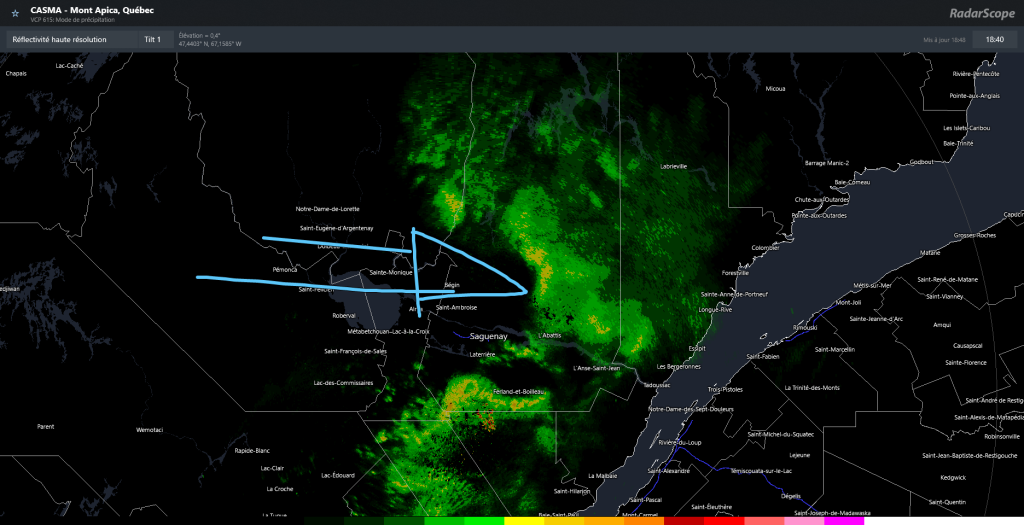 Ce sont des averses de pluie qui vont affecter l’ensemble de la région ce jeudi soir. Ces averses vont se poursuivre la nuit prochaine et être possiblement mélangées de neige fondante. En théorie ce sera sans accumulation de neige alors qu’au niveau des quantités de pluie ce sera entre 2 et 4mm au total.