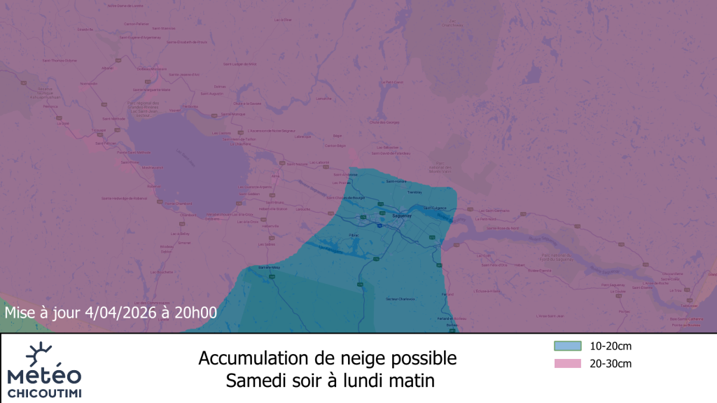 Il devrait tomber d’ici ce soir, entre 3 et 5mm de pluie puis ce sera suivi de 5 à 10cm de neige supplémentaire à ce qui est déjà tombé sur la région. Pour ce qui est des monts Valin, il pourrait tomber de 15 à 20cm de neige supplémentaire d’ici samedi matin.