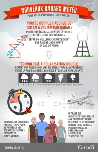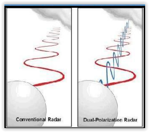 La grande différence entre les radars d’anciennes générations versus la nouvelle génération réside dans les ondes envoyées dans le ciel. L’ancienne technologie (simple polarisation) fonctionnait à l’aide d’onde envoyée dans le ciel, une seule onde horizontale était utilisée. La double polarisation permet l’émission simultanée d’une deuxième onde qui est verticale. La combinaison des deux ondes permet d’identifier plus précisément la forme de la précipitation afin de connaître le type de précipitation qui tombe du ciel.
