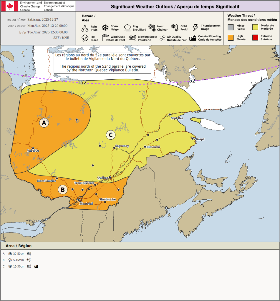 Tempête hivernale en route Quoi : neige abondante, vents et poudrerie. Quand : de lundi en mi-journée à mardi soir Informations supplémentaires : De 15 à 25 centimètres de neige accompagnés de rafales de vents forts créeront des conditions de tempête. De la poudrerie généralisée est attendue. La circulation sur les routes et les trottoirs pourrait être difficile. La visibilité pourrait être subitement réduite à presque nulle par moments. Prévoyez plus de temps pour les déplacements. Veuillez continuer à surveiller les alertes et les prévisions émises par Environnement Canada. Pour signaler du temps violent, envoyez un courriel à meteoQC@ec.gc.ca ou publiez un message sur X en utilisant #meteoqc. Pour obtenir plus de renseignements sur le programme d’alertes, veuillez consulter : Alertes météorologiques par code de couleur.